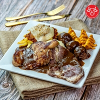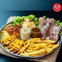 Chicken Grill x Lamb Grill x Chicken Parmigiana x (Spaghetti Bolognese beef) x Fries x Cheezy Wedges x Homemade Meatball 4 pcs (beef) x Black Pepper Sauce x Creamy Mushroom Sauce (3-4 pax)